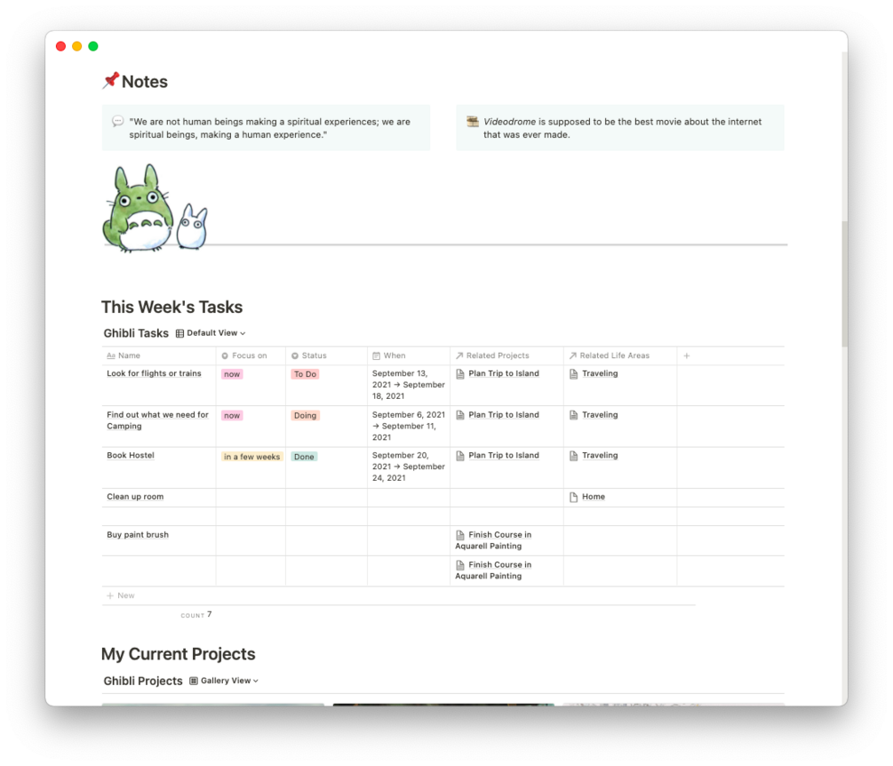 Notion Template: Studio Ghibli Workspace Kit, including Project Management Setup and Studio Ghibli decorations, as well as a walkthrough video