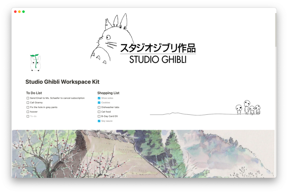 Notion Template: Studio Ghibli Workspace Kit, including Project Management Setup and Studio Ghibli decorations, as well as a walkthrough video